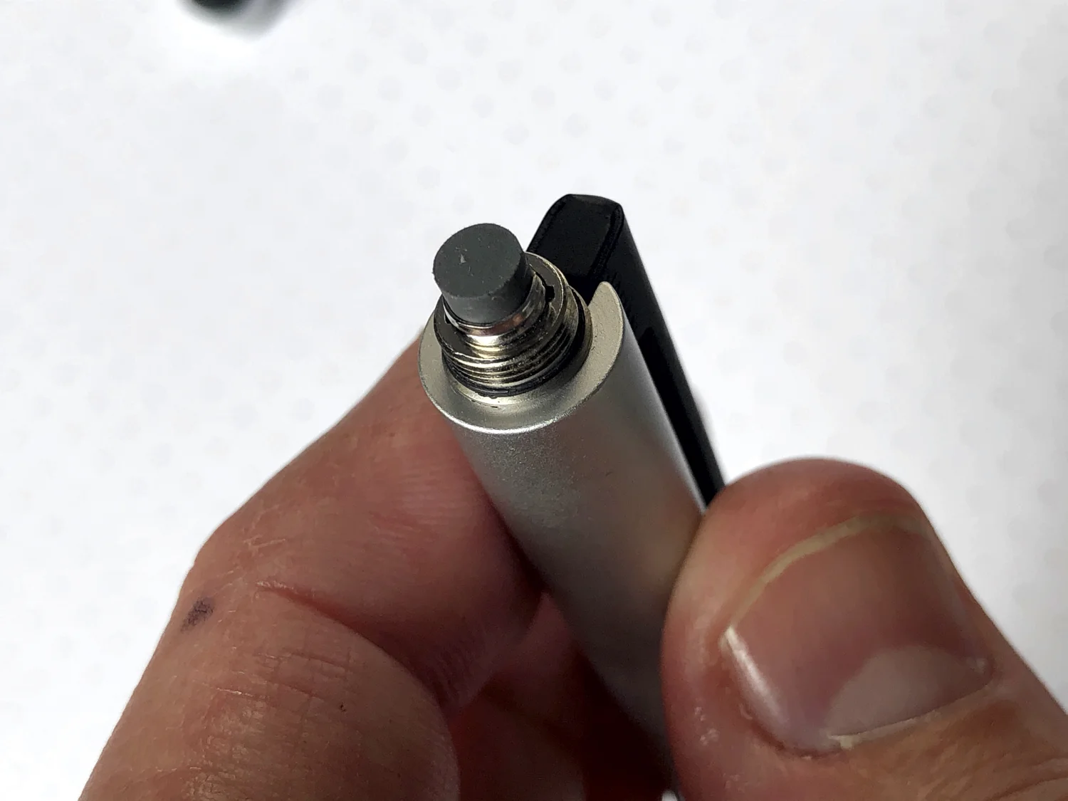 Unscrew the barrel, and the refills easily slide in. The pen features a smooth, rotating, click mechanism that works great. The back end of the pen features a rubber grip. Some have called it a stylus. It looks more like a convenient way to grip and flip pages to me. Unscrew that end and a small, replaceable eraser is found below.