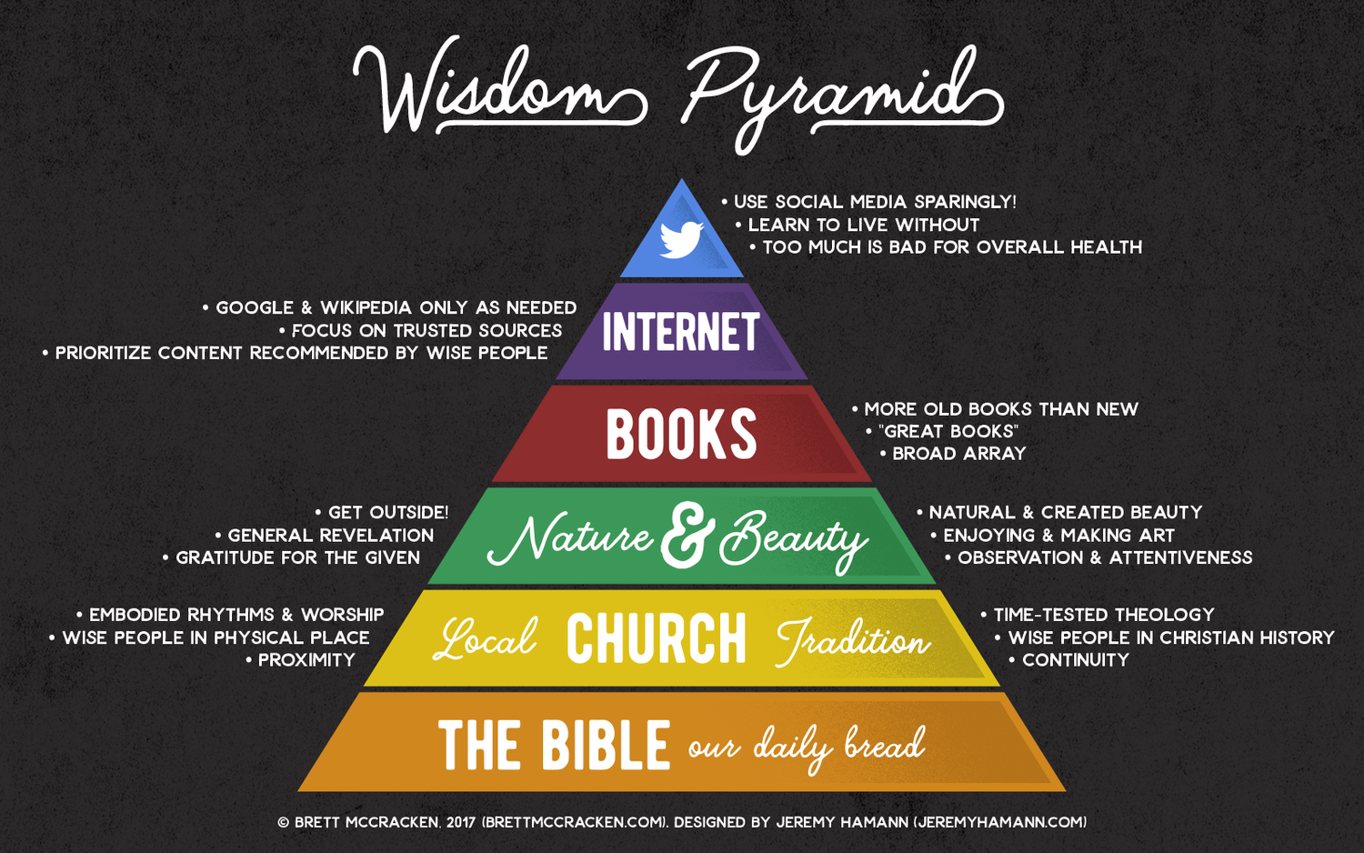 We also have to prioritize what’s important. Have you heard of the “wisdom pyramid” by Bret McCracken? He’s written a book by the same name. Check it out. What has to be our foundation? The Bible. This, he says, is our daily bread. What’s next, on top of that? The local Church. That offers embodied rhythms and worship, and wise people in our physical place. But also, we learn from our Church tradition. Time-tested theology and wise people in Christian history.